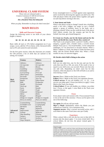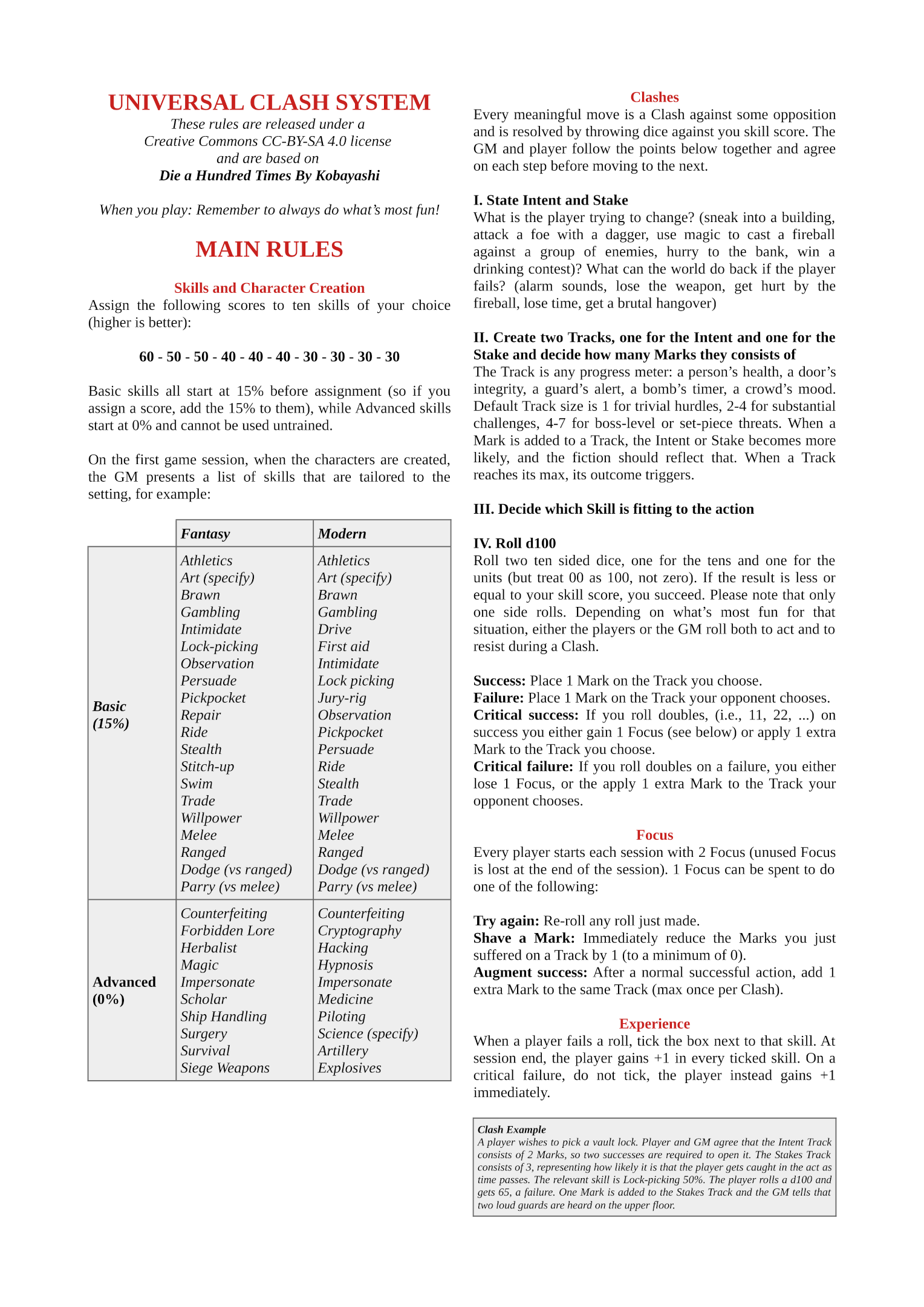 A minimalist 2-page d100 TTRPG based on DIE A HUNDRED TIMES by KobayashiLink: https://alexandre-kobayashi.itch.io/die-a-hundred-times